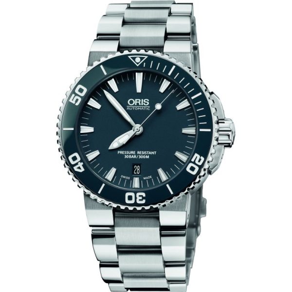 Uni-directional rotating silver-tone stainless steel with blue ceramic top ring bezel. Blue-green dial with luminous silver-tone hands and index hour markers. Minute markers around the outer rim. Luminescent hands and markers. Date display at the 6 o’clock position. Oris Calibre 733 Automatic movement, based upon Sellita SW200-1, containing 26 Jewels, bitting at 28800 vph, and has a power reserve of approximately 38 hours. Scratch resistant sapphire crystal. Screw down crown. Skeleton case back. Round case shape.